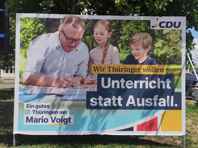 Und dann kommt das Plakat vom Hoffnungsträger CDU (lt. Umfrage 22,4%). Es ist darauf Mario Voigt zu sehen, wie er mit Kindern Schulaufgaben macht und der Spruch “Wir Thüringer wollen Unterricht statt Ausfall“. Eigentlich ganz nett. Aber als Lehrerin fallen mir da natürlich die ganzen alten Unsinnigkeiten in der Thüringer Bildungspolitik ein, die auf das Konto der CDU gehen, wie z.B. das Landeserziehungsgeld, dass in seiner ursprünglichen Form vor allem bildungsferne Kinder vom Kindergarten abgehalten hat oder, dass einfach gar nichts gegen den aufziehenden Lehrermangel getan wurde. Die jetzige Regierung hat es mir zumindest mit ihrer Regelung für Seiteneinsteiger ermöglicht, einen vollwertigen Abschluss als Regelschullehrer zu erlangen. Dass ich trotzdem nicht optimal im Schuldienst arbeiten kann, ist vor allem auf die bürokratischen Hürden und die komplette Überregulierung der Schulämter zurückzuführen. Aber das ist ein Problem, dass wir Deutschen wohl nie loswerden, egal, welche Partei gerade regiert. Die CDU hat jedenfalls in den Zeiten von Althaus und Lieberknecht hier in Sachen Bildung nicht wirklich geglänzt. Ich denke, die CDU spekuliert jetzt darauf, dass man das nach so langer Zeit vergessen hat. Wirklich problematisch ist aber dieses Koalitionsgebaren, denn 22% reichen halt nicht, wenn man vorher alles Mögliche ausschließt. Dass die AFD ausgeschlossen wird, ist nachvollziehbar und richtig. Aber wie weiter? Unverständlich für mich ist, und da fällt der CDU auch ihre rote Socken-Kampagne auf die Füße, dass Die Linke kategorisch ausgeschlossen wird, Wagenknechts BSW aber nicht.