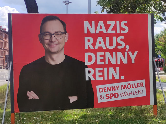 Auf dem nächsten Plakat, es ist von der SPD (lt. Umfrage 7,0%), steht “Nazis raus, Denny rein“. Da muss ich tatsächlich laut lachen. Nichts gelernt… Dieses plumpe AFD-Bashing ist so dermaßen kontraproduktiv, liebe SPD. Es bringt der AFD nur noch mehr Zustimmung ein, wegen der Opferrolle und so. Aber irgendwie ist es schon ein integraler Wesenszug der SPD an Dingen festhalten, die ganz klar nicht funktionieren. Zur Europawahl war es die Werbung mit dem unbeliebten Kanzler, hinsichtlich der Ukraine die halbseidene “Friedenspolitik“, die alles nur noch schlimmer macht. Stur bleibt man einfach dabei und hält weiter den Kurs. Und weil ja die Nancy Faeser gerade den Elsässer hochgenommen hat, ist die SPD jetzt die Antifa-Partei schlechthin. Oh Mann, ob sie sich den Quatsch selbst noch abkaufen?