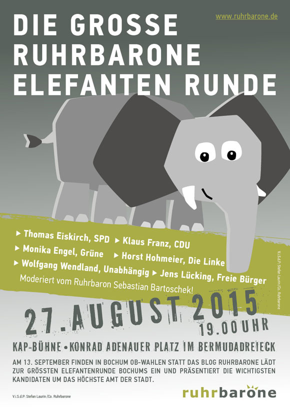 SB: Du machst auch damit Wahlkampf, dass, wer von der SPD aufgestellt wird, eigentlich auch gewählt wird. Es gibt das berühmte Bild von dem rot angestrichenen Besen, den man wählen könnte. Mit welcher Erwartungshaltung geht man denn dann als freier Kandidat neben – ich habe hier gerade nochmal unser Ruhrbarone-Elefantenrunden-Plakat raus gewühlt – sechs Kandidaten an so eine Wahl?