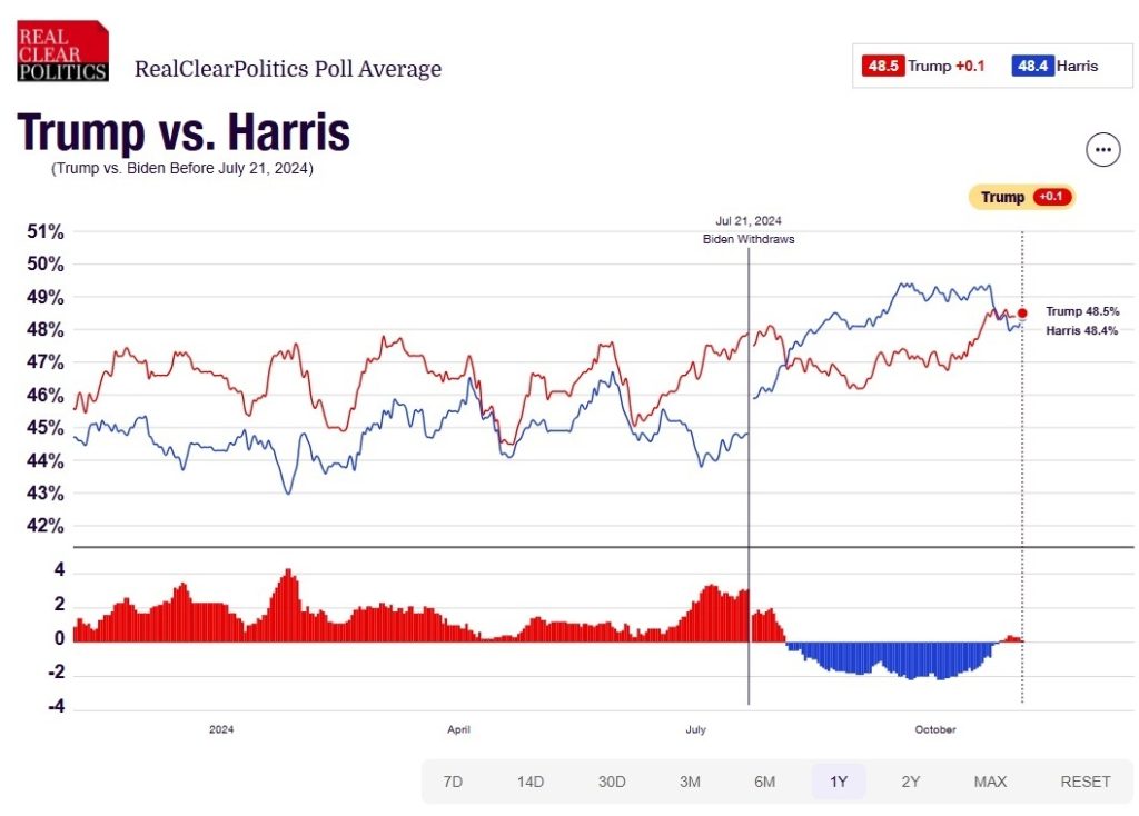 In der 1-Day-to-Election Umfrage führt Trump hierbei mit 0,1 %.
