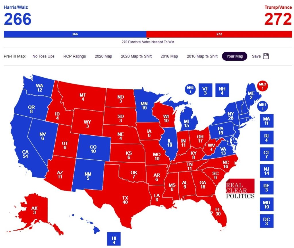 Am Ende läuft es eben auf Wahlmänner hinaus. Ausgehend von der RCP Analyse „sicherer“ Bundesstaaten habe ich mir die Battlegrounds angeschaut, Prognosen und Historie betrachtet und halte folgenden Wahlausgang für überwiegend wahrscheinlich.