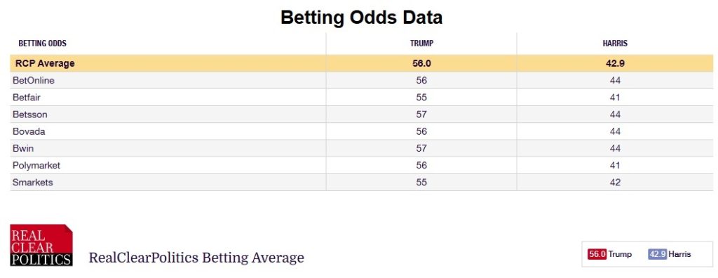 Bekanntermaßen verlor Clinton die Wahl aufgrund der geringeren Anzahl an Wahlmännern. Was die Auswertung jedoch zeigt ist, dass die Ergebnisse der demokratischen Partei zuletzt immer leicht überschätzt wurden. Ich gehe daher in der Annahme, dass Trump die absolute Mehrheit der Stimmen erzielen wird. Große, internationale Wettbüros und Agenturen teilen diese Einschätzung. Von sieben großen Wettagenturen, die Wetten auf die US-Wahl zulassen, gehen alle von einem Sieg von Donald Trump aus. Und das teilweise deutlich. Auch Kalshi Inc., einer der größten Anbieter von Ereigniskontrakten, sieht die Wahrscheinlichkeit eines Sieges von Donald Trump bei 54 %.