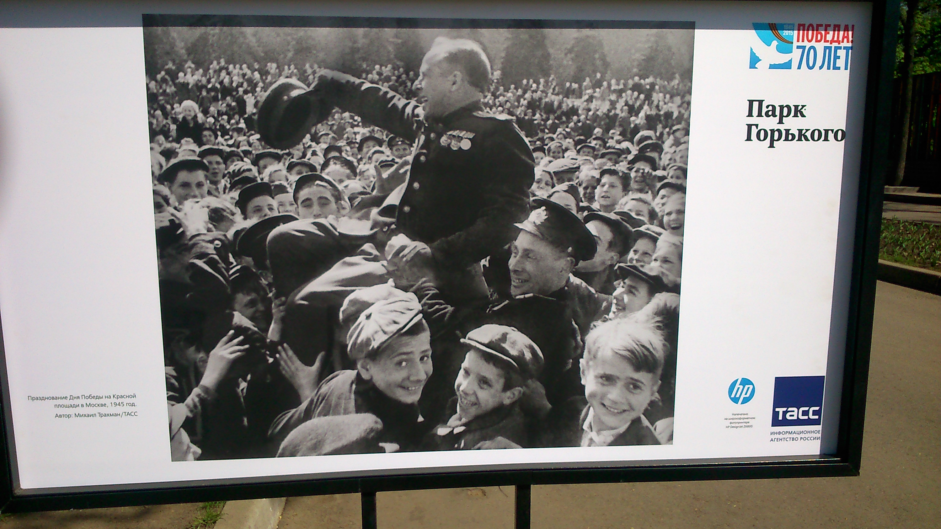 Denn dieser 70. Jahrestag zeigte sich an vielen Orten der Stadt noch von einer inhaltlichen, erinnernden und bedächtigen Seite. Überall in der Stadt, in den großen Shopping-Malls, in diversen Fußgängerzonen, zwischen Edelboutiquen und Nachtleben, in U-Bahn-Stationen, im Gorki-Park, in Eisenbahnwaggons am Twerskoi Boulevard, in einer Infobox in der Innenstadt, an Laternenmasten auf den Straßen gab es informative und eindrucksvoll bebilderte Ausstellungen rund um den Großen vaterländischen Krieg und seine Auswirkungen auf die Bevölkerung. Auf Schautafeln bebilderte Texte, Fotos, Kleidungsstücke, private Korrespondenz, Presseausschnitte, Uniformen, Gegenstände des Alltags wurden dem Betrachter präsentiert. Eine Ausstellung widmete sich unter dem Thema „Heldinnen des Krieges“ den Frauenschicksalen aus den Jahren 1941 bis 45. Eine Inszenierung im Rahmen der Parade skizziert die Befreiung des Konzentrationslagers Auschwitz durch die Rote Armee. Erwähnt werden muss in diesem Kontext ebenfalls die Aktion „unsterbliches Regiment“, mit der viele Menschen durch mitgeführte Großporträts ihrer beteiligten Familienangehörigen gedachten und an sie erinnerten. Auf eben diese Form des Erinnerns, der Erinnerungsarbeit, des Gedenkens und des Dankes besteht angesichts von über 27 Millionen toten Sowjetbürgern ein legitimer Anspruch, den zu erfüllen die vielfältigen Ausstellungen und Aktionen am Rande der offiziellen Festlichkeit beigetragen haben. Wenn im Vorfeld dieser Tag und seine Bedeutung unter Verweis auf tagesaktuelle Machtpolitik diskreditiert, denunziert und boykottiert wurde, haben offensichtlich schlichtweg Anstand, Respekt, Ehrerbietung und Dank für die Opfer und Über lebenden des Krieges auf russischer Seite und jegliches Schamgefühl aufs Erbärmlichste vor politischem Kalkül und herbeischwadronierter kollektiver Befindlichkeitsstörung kapituliert.