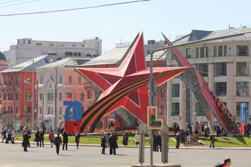 Tage vor Beginn der offiziellen Feierlichkeiten schon waren Laternen der größeren Straßen der Hauptstadt mit roten und orangefarbenen Flaggen geschmückt, an allen bedeutenden Gebäuden hingen neben der Nationalflagge die Hauptstadtflagge mit Stadtwappen und eine an den 70. Jahrestag des Gedenkens erinnernde stilisierte Sowjetfahne. Überdimensionale rote Sterne, ob als Lichtinstallation auf dem roten Platz, mit dem Georgsband versehen am Lubjanka-Platz oder in Form des „Ordens des vaterländischen Krieges“, aufgeklebt an zahlreichen Lampen der U-Bahn, Hoteltüren, Schaufenstern, Erinnerungssymboliken waren überall zu sehen. Kaum ein Mensch im Straßenbild, der nicht an Arbeits- oder Alltagsbekleidung tagelang mit dem zur Schleife gebundenen orange-schwarz gestreiften Georgsbändchen herum lief. Das ehemals zaristische Symbol wurde anlässlich des 60. Jahrestages umgewidmet zum Zeichen des Gedenkens an den Jahrestag des Sieges, während Krim- und Ukrainekrise vereinnahmt als Erkennungszeichen prorussischer Demonstranten.