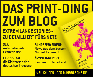 Wer also in der Hauptstadt ist und lange Geschichten lesen will, kann sich Montag bis Freitag, 8 – 20 Uhr, im taz shop, Rudi-Dutschke-Str. 23, U-Bahn-Halt Kochstraße, mit der neuen Ausgabe der Ruhrbarone eindecken.