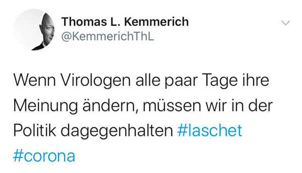 Wenn Herr Kemmerich also das Laschet-Zitat twittert („Wenn Virologen alle paar Tage ihre Meinung ändern, müssen wir in der Politik dagegenhalten“), dann beschwört er die Idee, es sei irgendwie mannhaft oder konsequent, zu einer Meinung zu stehen, die inzwischen überholt ist. Dabei ist eben das Gegenteil der Fall. Es ist redlich und erfordert Mut, seine Aussagen zu revidieren, sobald neue Tatsachen ans Licht kommen. Dies ist in der Wissenschaft der Normalfall (auch wenn das nicht heißt, dass es dem einzelnen Wissenschaftler nicht manchmal schwerfällt, diesen wissenschafltichen Normalfall