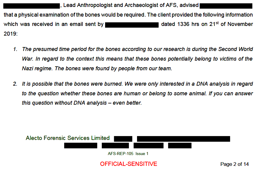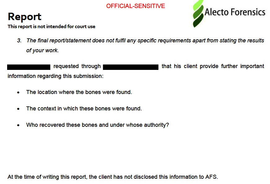 Auch die Wissenschaftler von „Alecto Forensics“ scheinen sich die gleichen Fragen bei dem Ansinnen des ZPS gestellt zu haben, wie die deutsche Öffentlichkeit. Im Laborbericht sind folgende Fragen erwähnt, die man vom Auftraggeber gerne beantwortet wissen wollte: An welchem Ort wurden diese Knochen gefunden? In welchem Kontext wurden diese Knochen gefunden? Wer hat die Knochen geborgen und unter wessen Aufsicht? Der Report stellt fest, dass das ZPS diese Fragen den Forensikern bis zur Abfassung des Berichtes nicht beantwortet hat.
