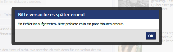 „Seit einer knappen Stunde funktioniert auf Facebook nichts mehr: Das Erstellen und Teilen von Beiträgen, das Liken oder Kommentieren von Beiträgen geht nicht. Ob die Seite weltweit ausgefallen ist, ist derzeit noch nicht bestätigt. Auch ob es sich um einen internen Fehler oder ein Hacker-Angriff handelt, ist nicht bekannt. Die Online-Nachrichtenseite thinkdigit.com schreibt, zumindest europäische und indische Server seien betroffen – die eurasischen Nutzer sind vom sozialen Netzwerk damit vorerst abgeschnitten. Auf Twitter klagen jedoch auch Nutzer aus Amerika.“
